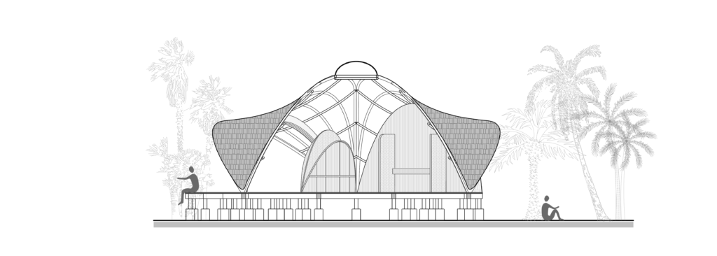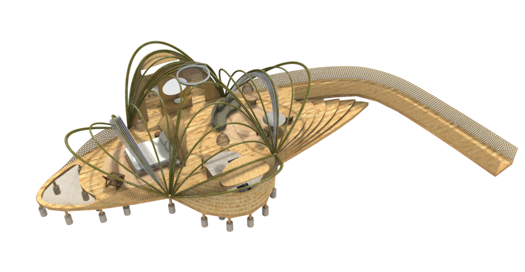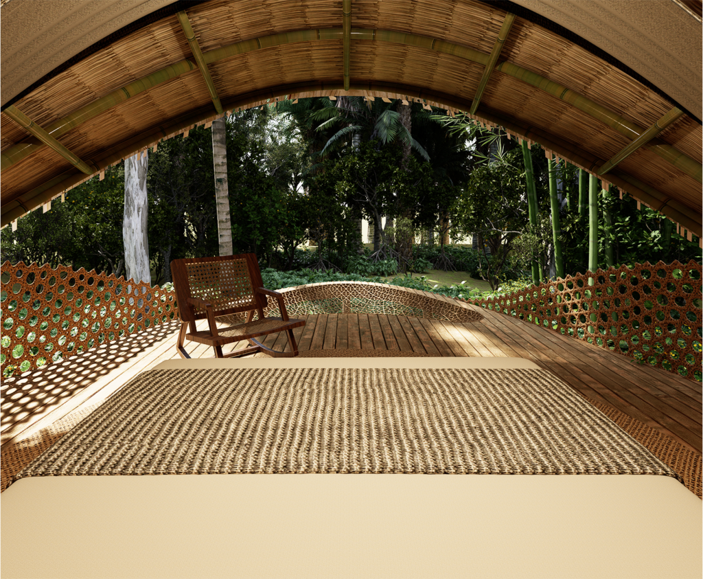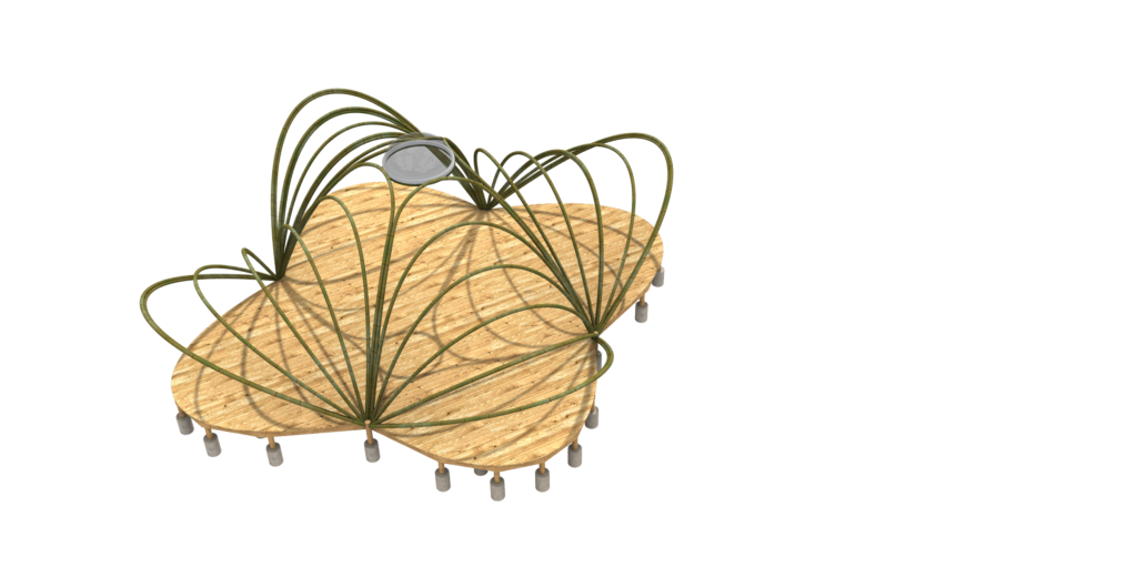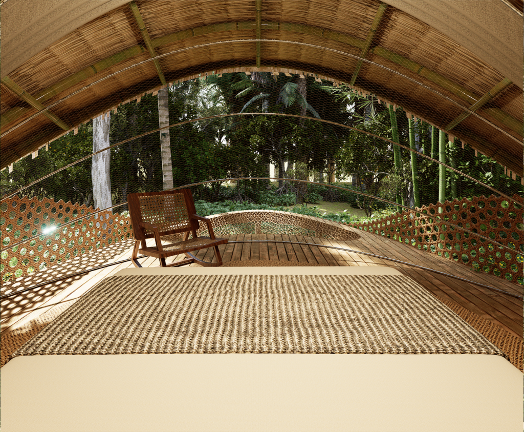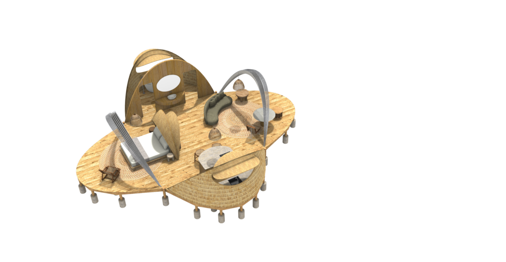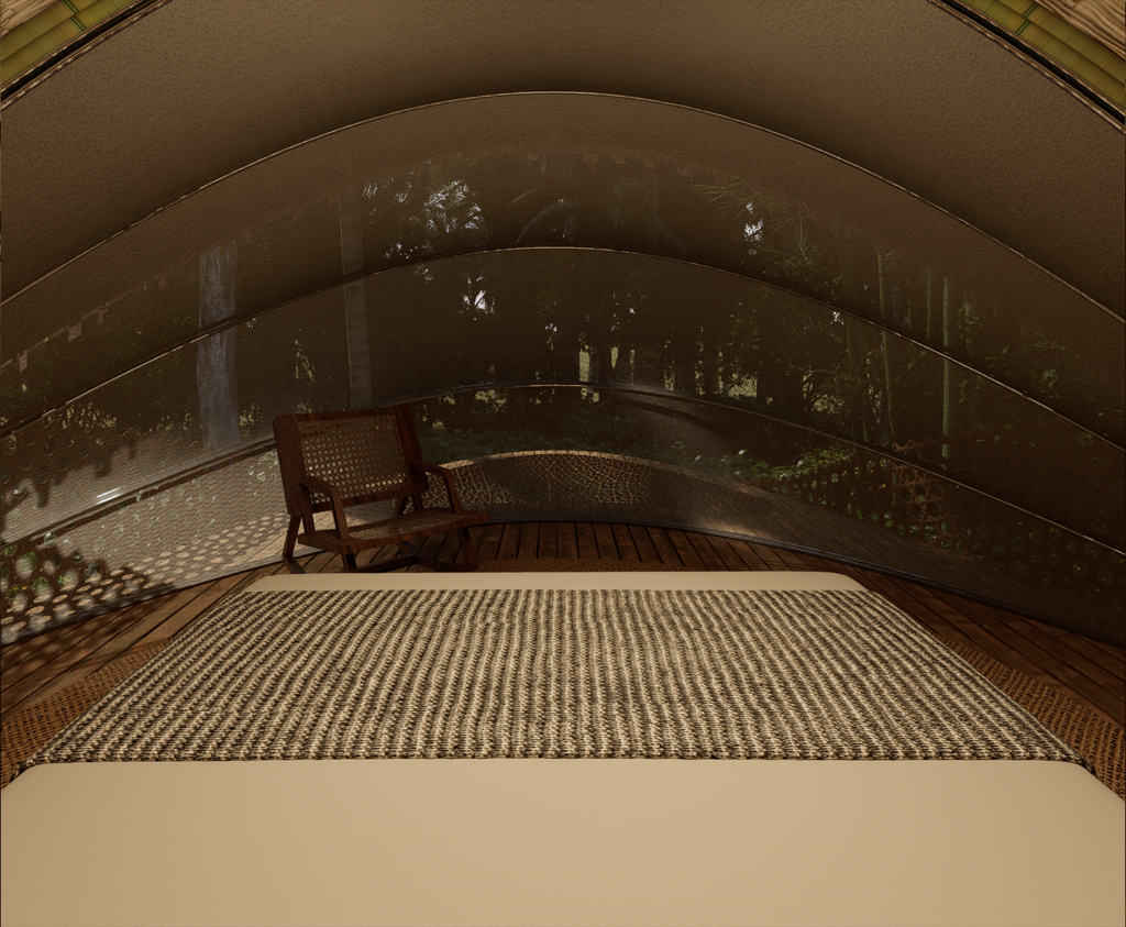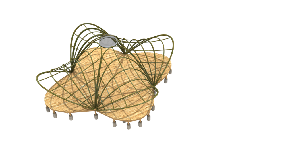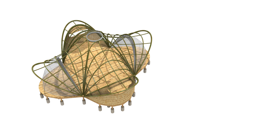 The cabin is organised around a central void that structures four main spaces: living and entrance area, bedroom, kitchen, and bathroom, allowing for fluid circulation and multiple layout configurations. The square plan, supported by only four corner points, reinforces spatial openness and adaptability. Its modular arched structure enables height and angle adjustments, while the enclosure combines fibre-based framing with woven palm infill and horizontal pivoting windows, integrating vernacular techniques with computational design.