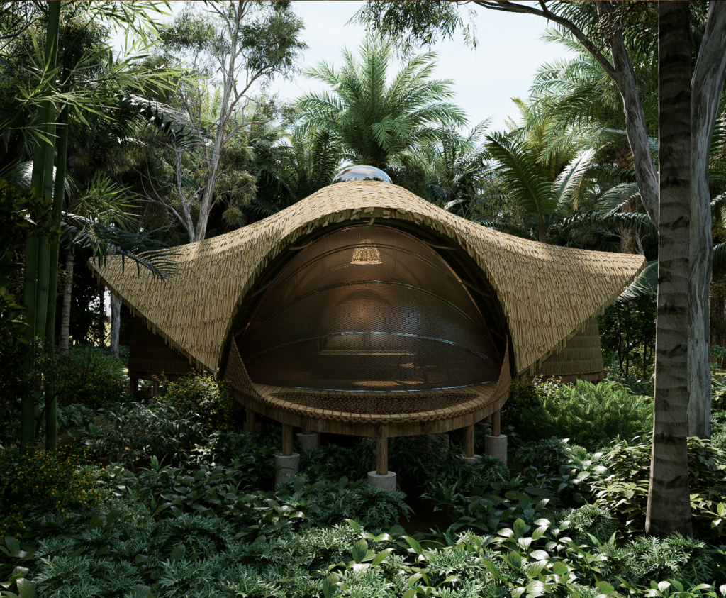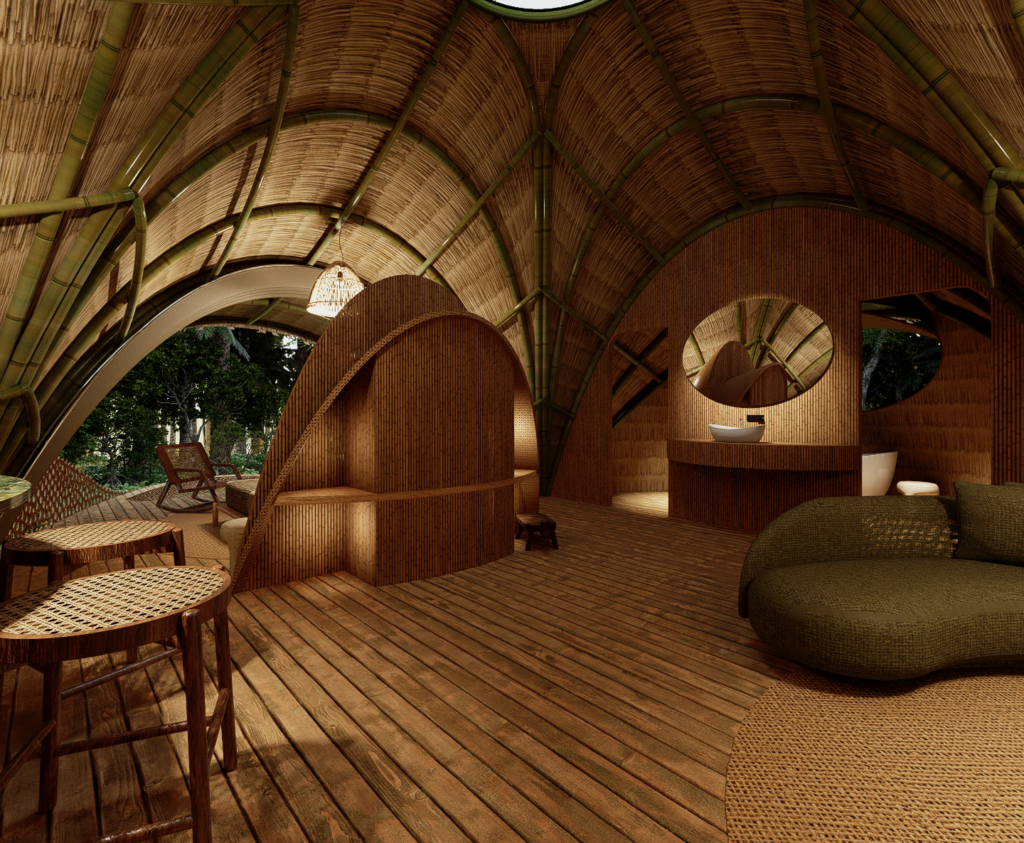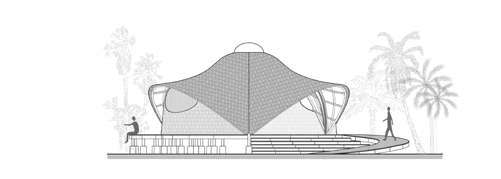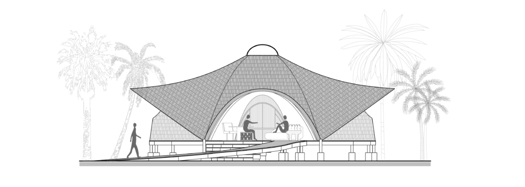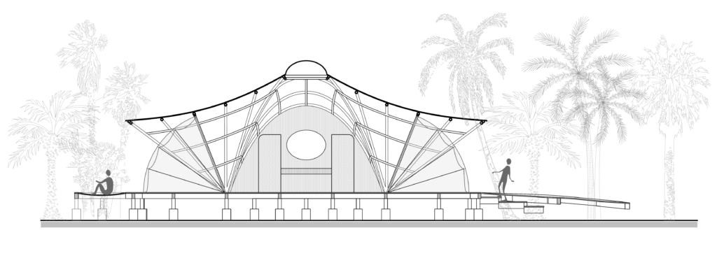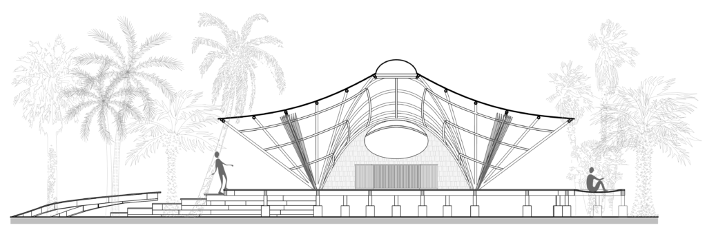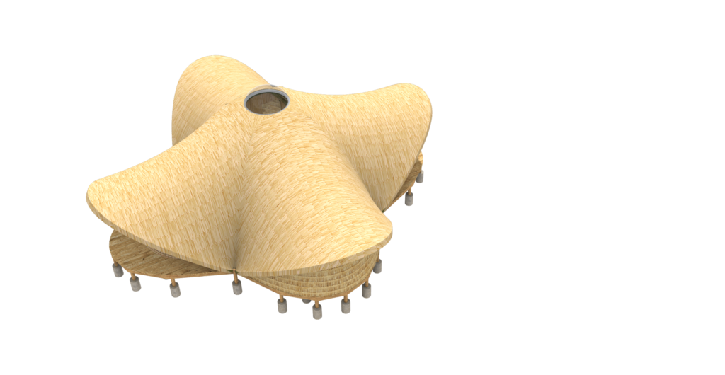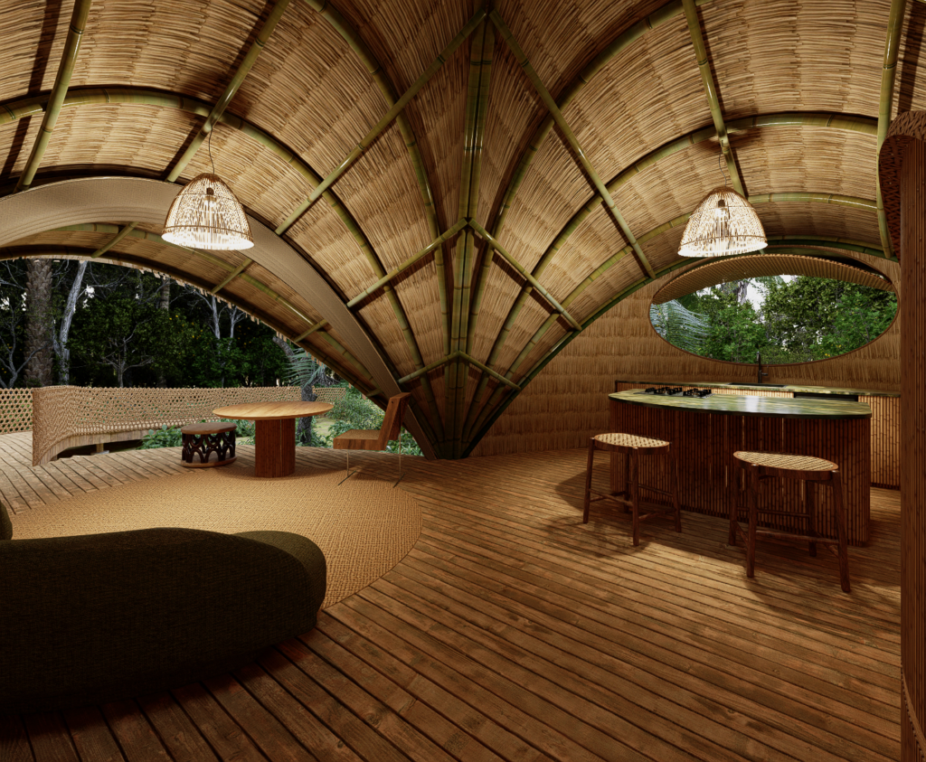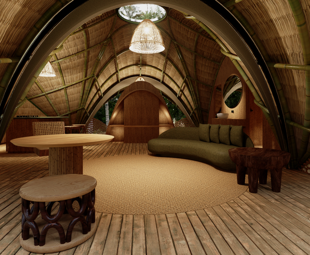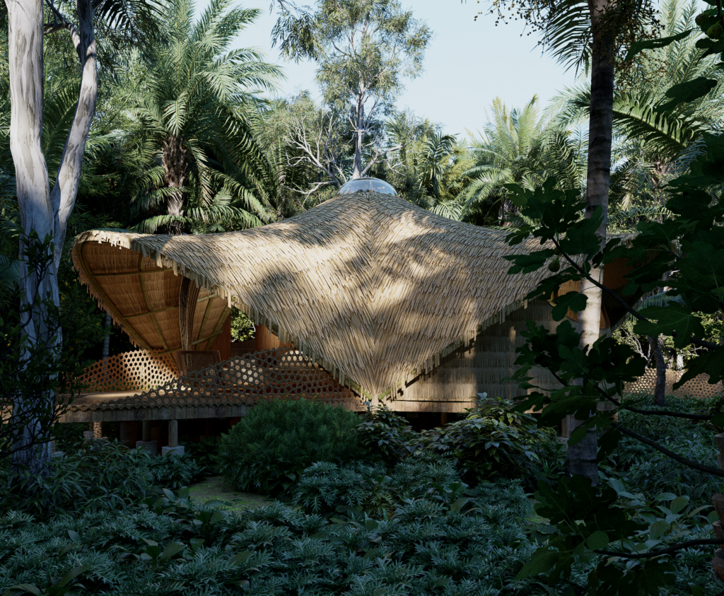 The cabin is organised around a central void that structures four main spaces: living and entrance area, bedroom, kitchen, and bathroom, allowing for fluid circulation and multiple layout configurations. The square plan, supported by only four corner points, reinforces spatial openness and adaptability. Its modular arched structure enables height and angle adjustments, while the enclosure combines fibre-based framing with woven palm infill and horizontal pivoting windows, integrating vernacular techniques with computational design.