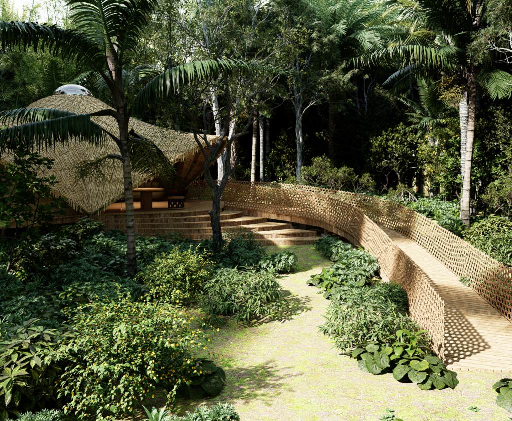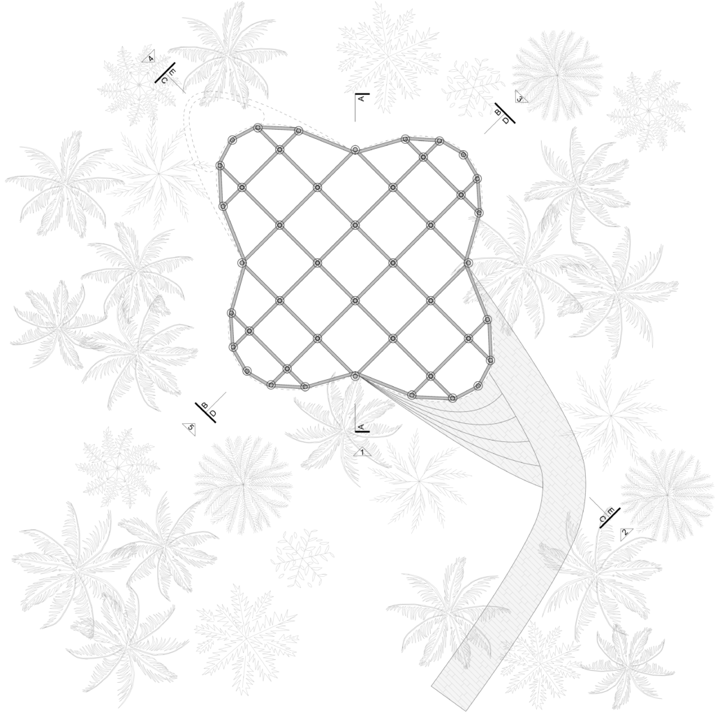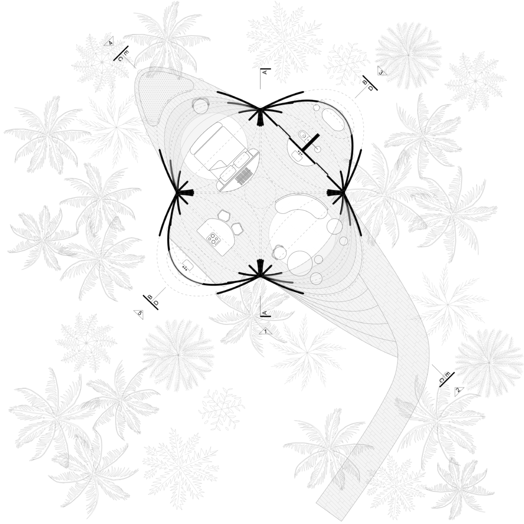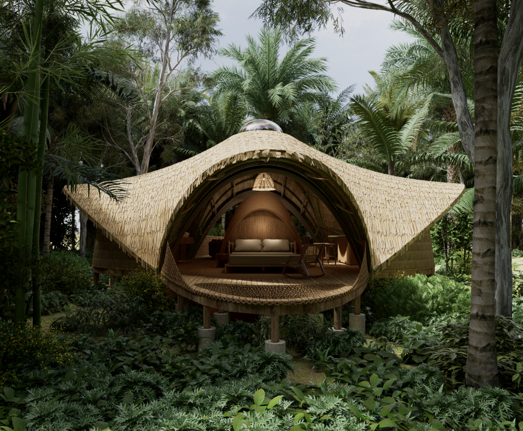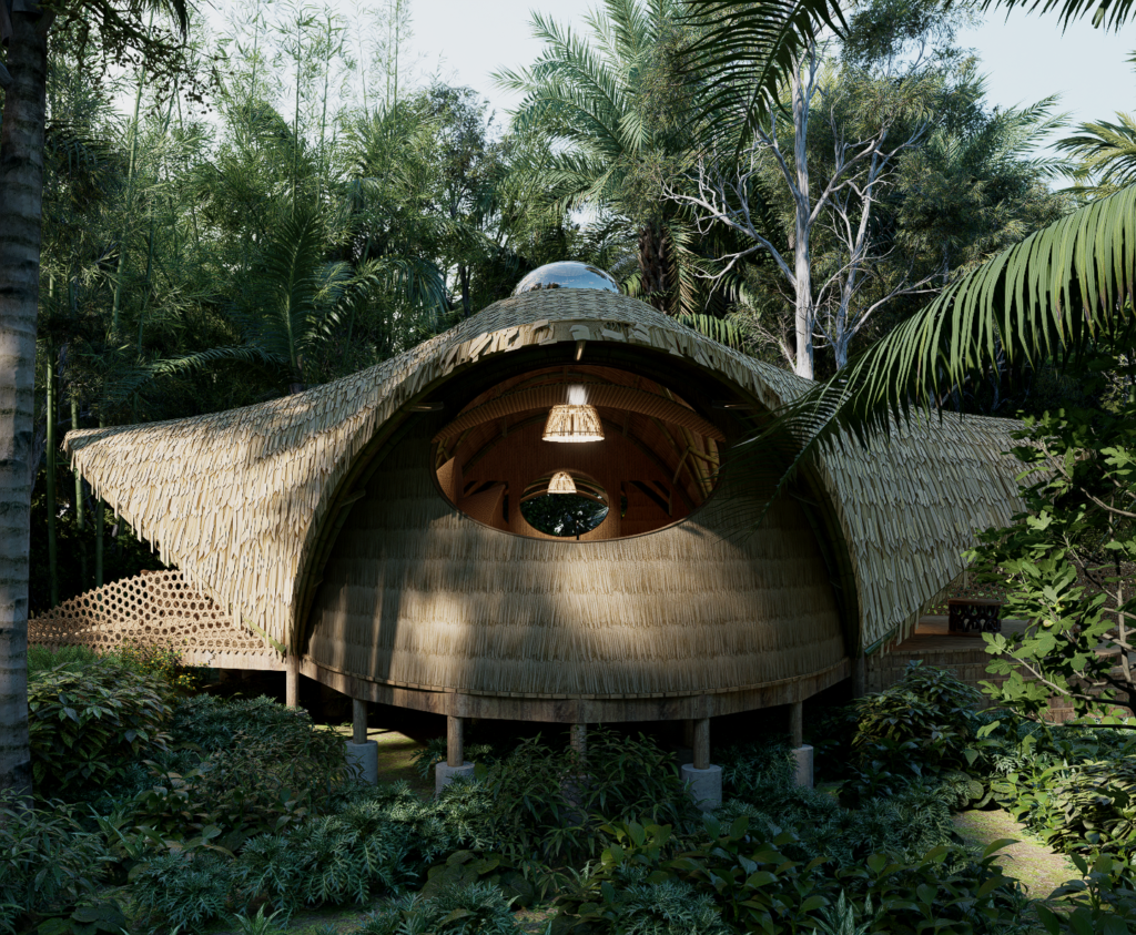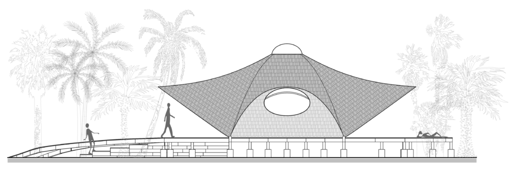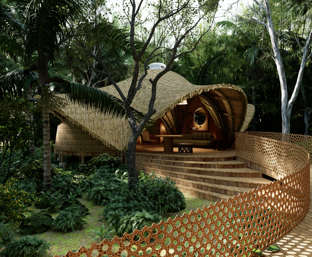 The cabin is organised around a central void that structures four main spaces: living and entrance area, bedroom, kitchen, and bathroom, allowing for fluid circulation and multiple layout configurations. The square plan, supported by only four corner points, reinforces spatial openness and adaptability. Its modular arched structure enables height and angle adjustments, while the enclosure combines fibre-based framing with woven palm infill and horizontal pivoting windows, integrating vernacular techniques with computational design.
