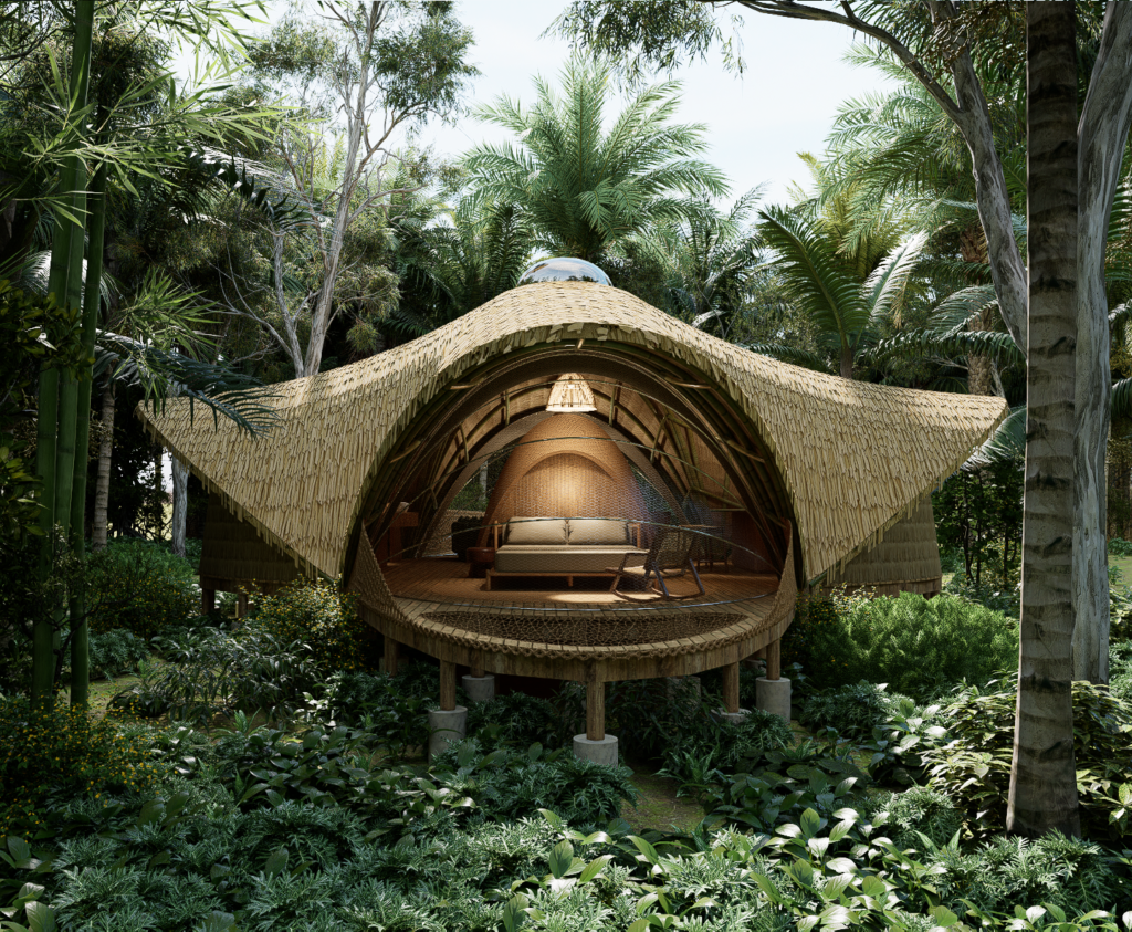 The kitchen and bathroom are enclosed with walls and windows made of woven thatch, while the entrance and bedroom have retractable closures made of mosquito netting and fabric.